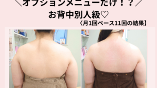こんにちは♪オーナーの山田です。今日は、フェイシャルのお客様ですが、フェイシャルのお手入れ時に一緒にさせて頂いているオプションメニュー『背中・二の腕美姿勢マッサージ』でボディもとてもいい結果が出ているので、データ写真をご紹介していきたいと思...