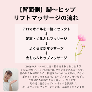 実は、1つ前のブログのバストアップのマッサージと同様、こちらの『背面側 脚~ヒップリフトマッサージ』もBodyのメニューには元々組み込まれています!