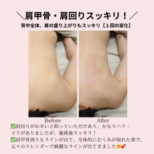 1回でもしっかりと変化をご実感頂け、施術後『肩も軽いし、下着を付けた感じも違うし、ウエストも違うし、なんかさっきまで着ていたジャケット、腕のとこがゆるくなってるよー😍✨!』と沢山変化をご実感頂け、喜んで頂け、私も嬉しかったです。
