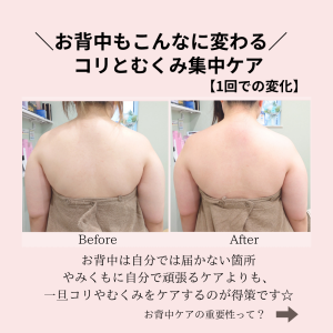 当店のお背中ケア(背中・二の腕美姿勢マッサージ)は、本当に気持ちが良く、リラックス効果も高いため、とてもご好評いただいておりますが、なんと言っても人気の理由は、『しっかりと実感できる変化』だと思います。