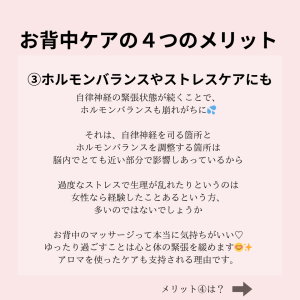 ストレス過多でホルモンバランスが崩れがちな現代社会で頑張る女性の味方になってくれるのがお背中ケア❗本当に気持ちがいいので、すごくオススメです♡