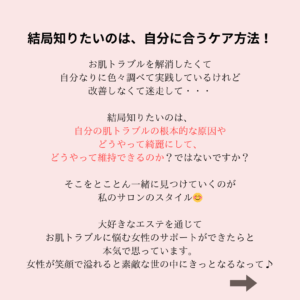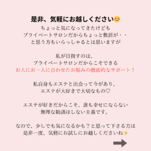 最初は勇気がいるとは思うんですけど、私だからこと伝えられることがきっとあるので、一度当店のエステでのお肌ケアをお試し頂きたいなと思っています。