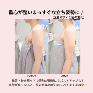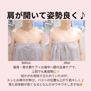 肩が前に入ってしまっていましたが、巻き肩ケアで肩が開きバストも持ち上がった感じに♪