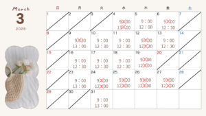 ※基本的には①9:00~②12:00 or 13:00~の2部制となりますが、営業時間(平日火~金の9:00~15:00)内であれば、記載以外の時間のご予約も承ります。