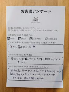 ・普段から5時間睡眠!とお仕事がとてもお忙しい方。お仕事柄、パソコンやスマホを触っている時間が長く、肩コリ、首コリ、そしてお背中のラインを気にされておりました。