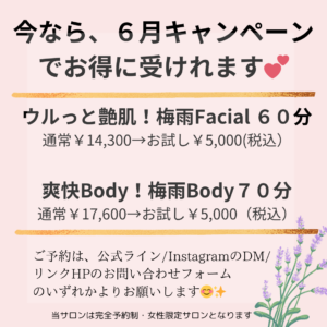 上記の項目が当てはまる方は、是非、この6月ならではの限定メニューを受けてみてください☆