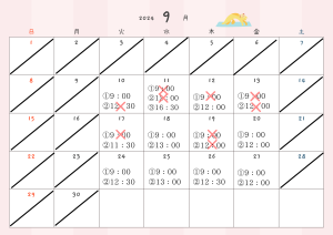 ※基本的には①9:00~②12:30~の二部制となりますが、日によって変則的な日もございます。