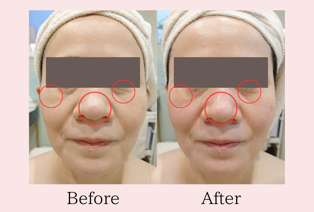 ・そして、お越し頂いた時はメイクをされていましたが、メイクオフした素肌の状態でも水分量が上がり、全体的に透明感や艶が出て、血色が良いお肌になっているのがお写真からもわかるかと思います😊