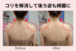 巻き肩ケアもしている為、肩が開き、バスト横に流れていた胸元もスッキリとし、本来の位置に戻すことができました😊