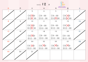 ※基本的には①9:00~②12:00~の二部制となりますが、日により変則的な日もございます。