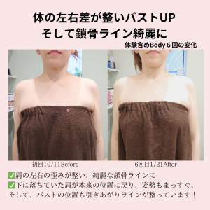 初回では、右肩と左肩の位置が違っていたりと、歪みも出てしまっていたのですが、巻き肩ケア・猫背ケアも同時にできる当店のマッサージをさせて頂くことで、回を重ねる毎に左右差が整ってきました!